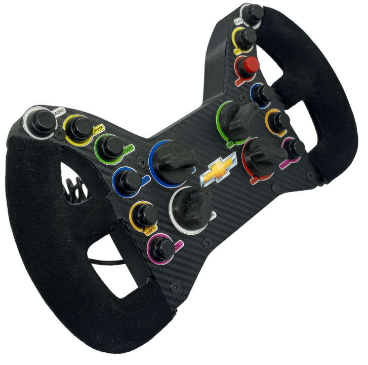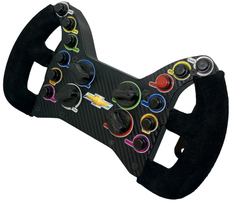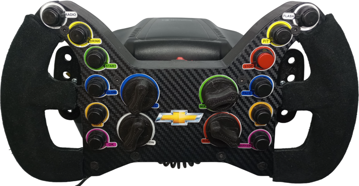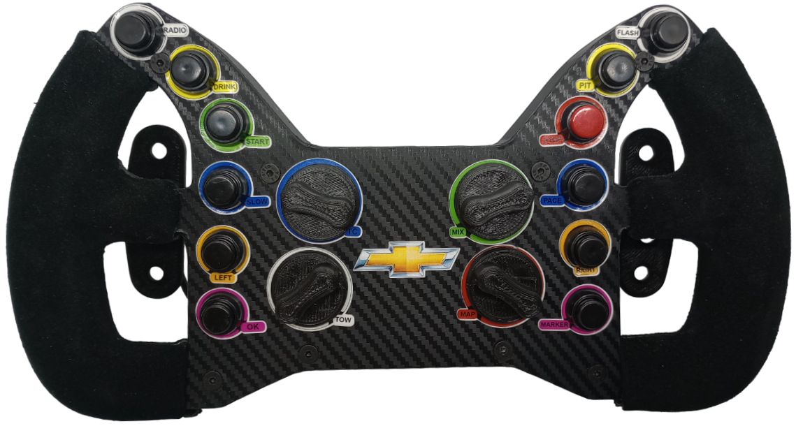 Volante modelo CORVETTE IMSA con levas magnéticas y 12 pulsadores personalizables y 4 Rotarys Con pulsadores. Cuenta con Quick Release incorporado compatible con Thrustmaster T300.